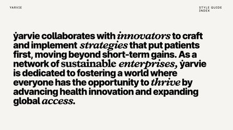Yarvie is a visionary business founded by two incredible individuals dedicated to shaping enterprises that drive health innovation and global access—creating a world where everyone can thrive. It was an honor to bring their vision to life through bold, expressive branding that reflects their big-picture thinking.